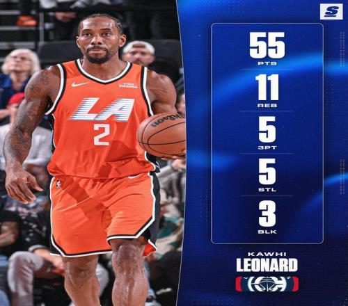 小卡在此役還創(chuàng)下了兩大NBA歷史第1的神跡。第1、數(shù)據(jù)顯示,萊昂納德單場至少55分10籃板5搶斷3蓋帽,是NBA歷史首次出現(xiàn)。