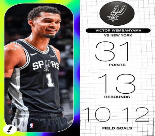 這是兩隊自NBA杯決賽后的第一次碰面,馬刺成功完成復(fù)仇,當(dāng)家球星文班亞馬首發(fā)只打了不到24分鐘,投籃12中10,三分2中2,罰球10中9,拿下31分13籃板,正負(fù)值高達(dá)+17。