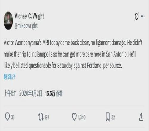 北京時(shí)間1月2日凌晨,據(jù)馬刺隨隊(duì)記者M(jìn)ichael C. Wright報(bào)道,文班亞馬沒有隨隊(duì)前往印第安納波利斯,而是留在圣安東尼奧接受進(jìn)一步治療,他確定缺席1月3日和步行者的比賽。MRI檢查結(jié)果顯示,文班亞馬沒有結(jié)構(gòu)性的損傷。
