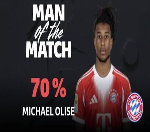 德甲第16輪,拜仁慕尼黑主場8-1大勝沃爾夫斯堡,此役貢獻兩球一助的拜仁邊鋒奧利塞當(dāng)選德甲官方全場最佳球員。